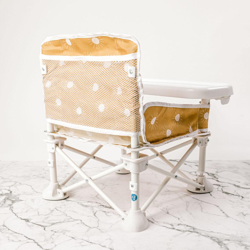 Suitable from around 6 months to around 2-3 or 15kg. Best suited for use on the ground, at the beach or park for picnics. Our campie chair comes with matching carry-bag, and 2 anchor straps for attaching to a dining chair for family meal times!