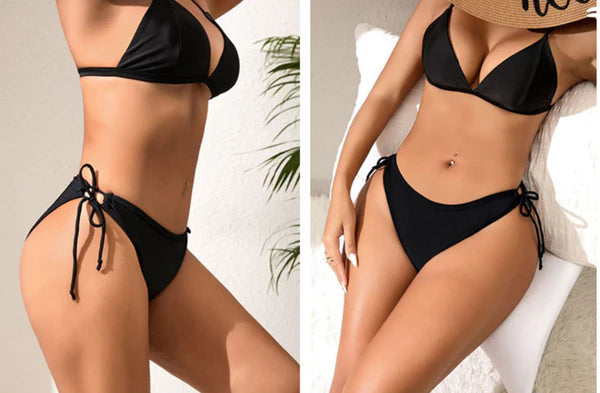 LOOK AND FEEL: Black lycra swim bottoms. High cut leg and a slight cheeky bottom. The tie sides make it easy to fit different sized bottoms!