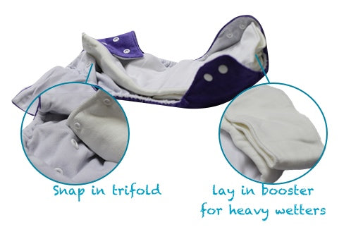 Snap in Bamboo Booster Set that gives up to 12 layers of absorbency: The snap in 2 layer trifold has a suedecloth panel in the centre which helps keep your baby dry. There is an additional 3 layer lay in booster. The booster can be folded in half and positioned exactly where it is needed. The booster set is made from custom milled 500gsm bamboo fleece giving 9-12 layers of super thick bamboo‚ which is super thirsty.